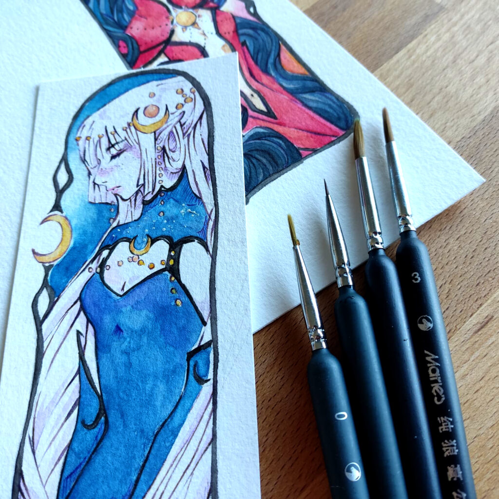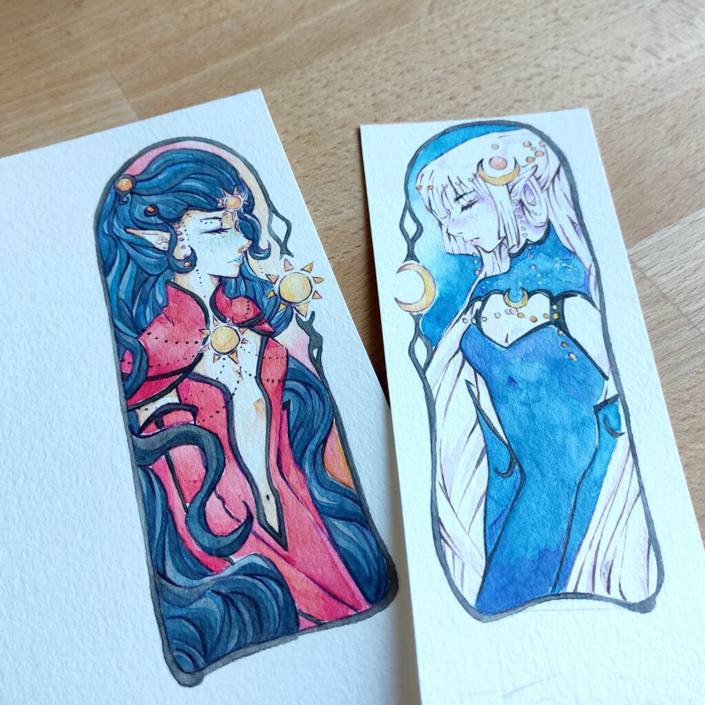 Ich habe diese 2 neuen Motive komplett mit den neuen Pinsel gemalt. Es sind Elfen Zeichnungen für Lesezeichen, die ab jetzt in unserem Kreativshop zu finden sind.