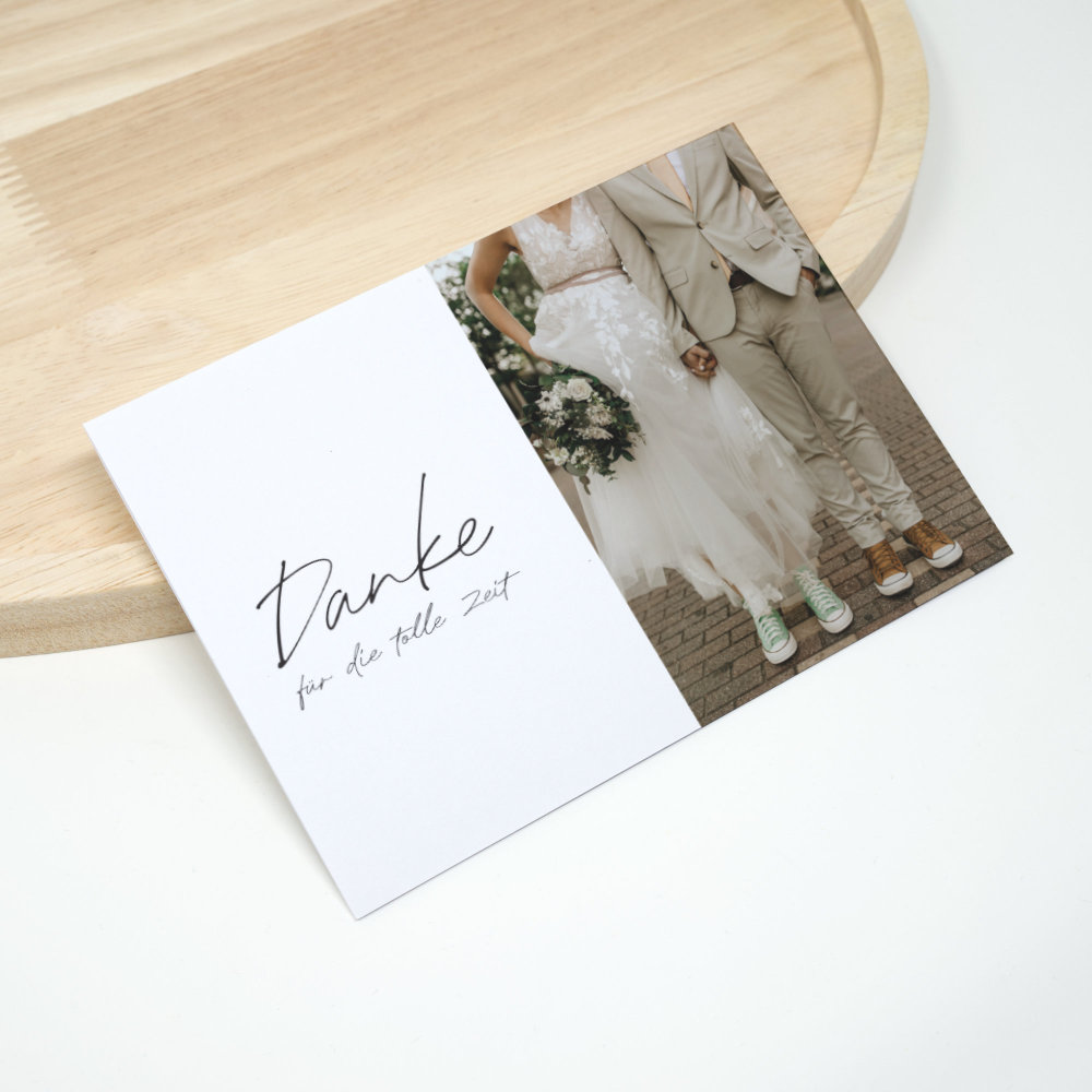 Deine Dankeskarte wird auf einer A6 Karte gedruckt (beidseitig): vorne mit eurem Foto und hinten mit einer persönlichen Danksagung auf der Rückseite. Durch die Papierstärke von 400 g/m² Papier hat sie eine gute Festigkeit und wirkt dadurch hochwertig.