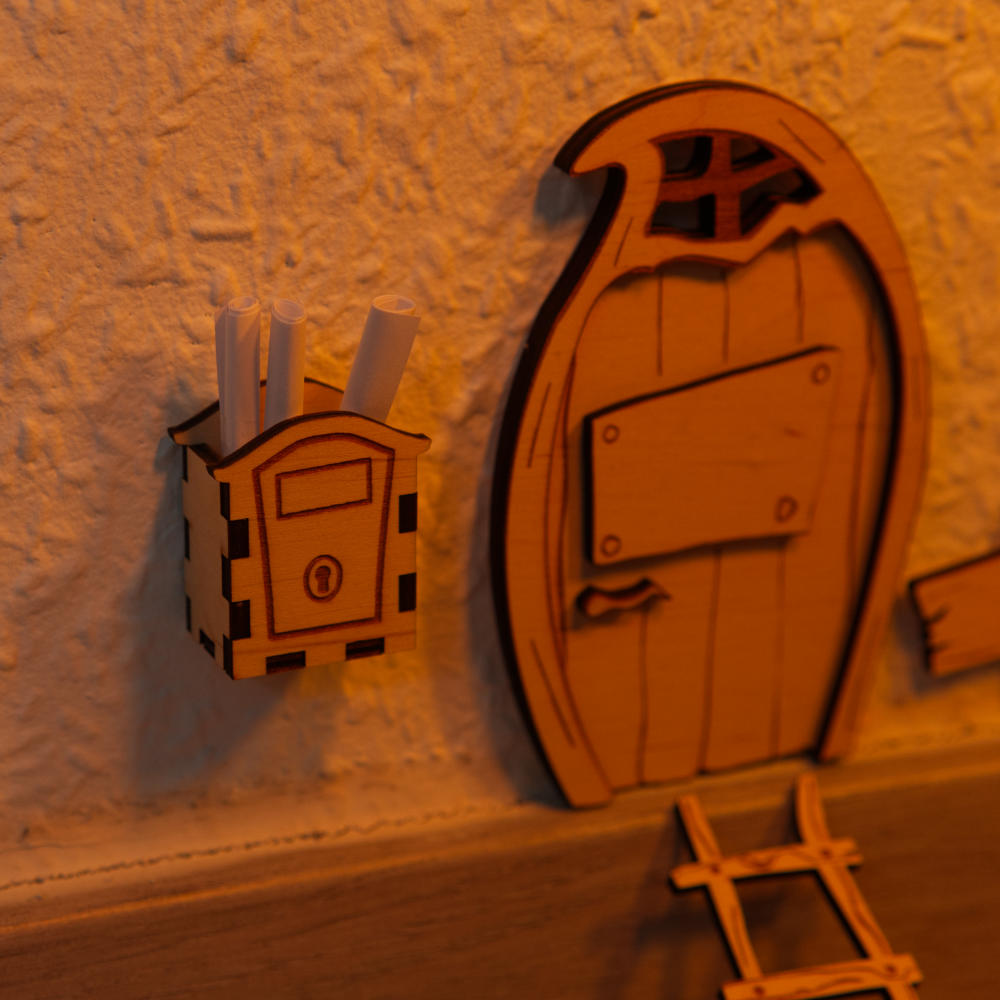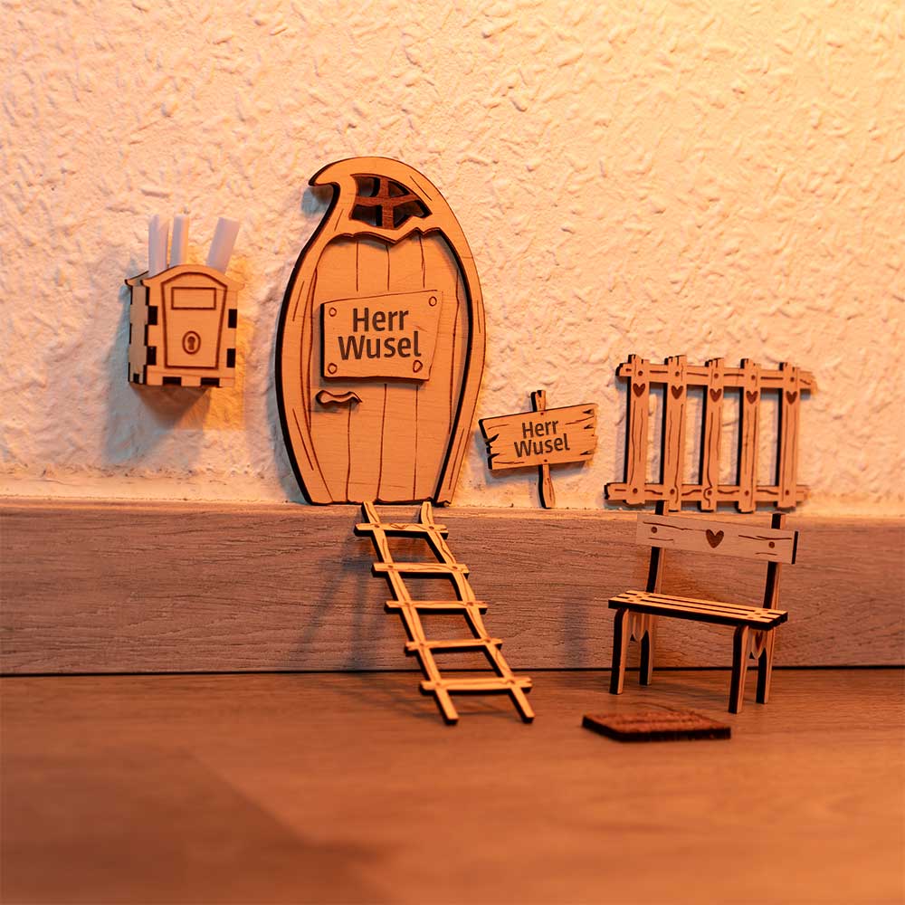 Die Tür und das Schild können mit einem Wunschtext personalisiert werden. Zudem haben wir für dich noch eine kostenlose Weihnachtsliste (Passwort wird der Bestellung beigefügt) zum Ausdrucken für den Wichtel vorbereitet. Die Wunschliste dann einfach zusammenrollen und in den Briefkasten legen.