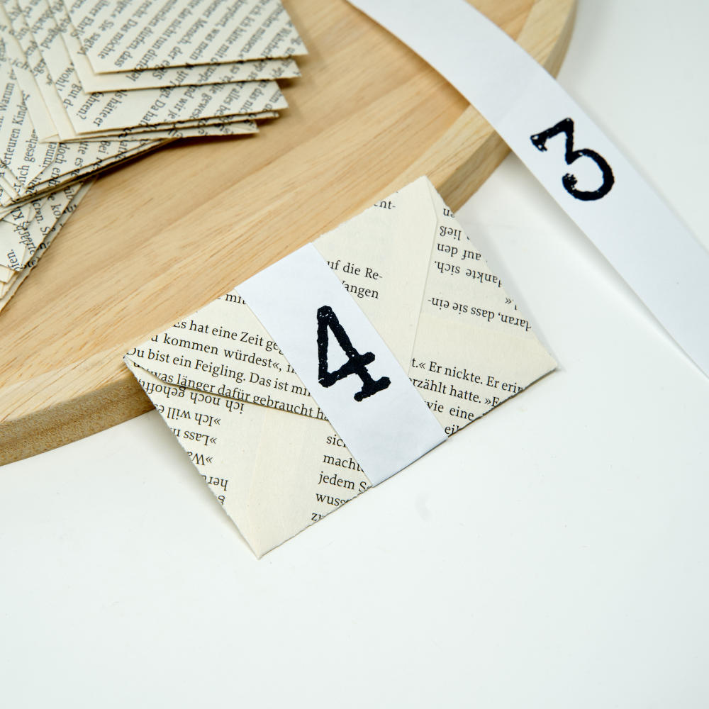 Ein Adventskalender für alle, die es gerne persönlich und kreativ mögen: Du bekommst 24 kleine Umschläge aus echten, zufällig ausgewählten Bücherseiten. Jeder Umschlag ist ein Unikat und wird mit einer Zahlenbanderole verschlossen. Die passenden Adventskalender-Zahlen stellen wir dir als kostenlosen Download zur Verfügung, damit du deinen Kalender ganz nach deinen eigenen Ideen gestalten kannst.