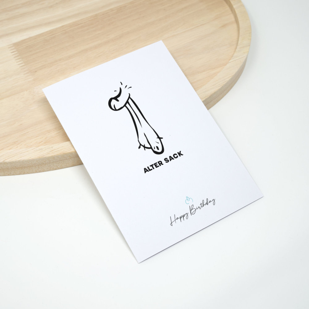 Geburtstagskarte - Alter Sack ist eine Karte für alle, die zum Geburtstag lieber mit einem trockenen Spruch um die Ecke kommen statt mit Blümchen-Texten. Sie ist als A6 Klappkarte (230 g Papier matt) handgefalzt und lässt sich innen gut beschriften. Dazu bekommst du einen passenden, von uns handgefertigten Briefumschlag – damit du die Karte direkt verschenken kannst.