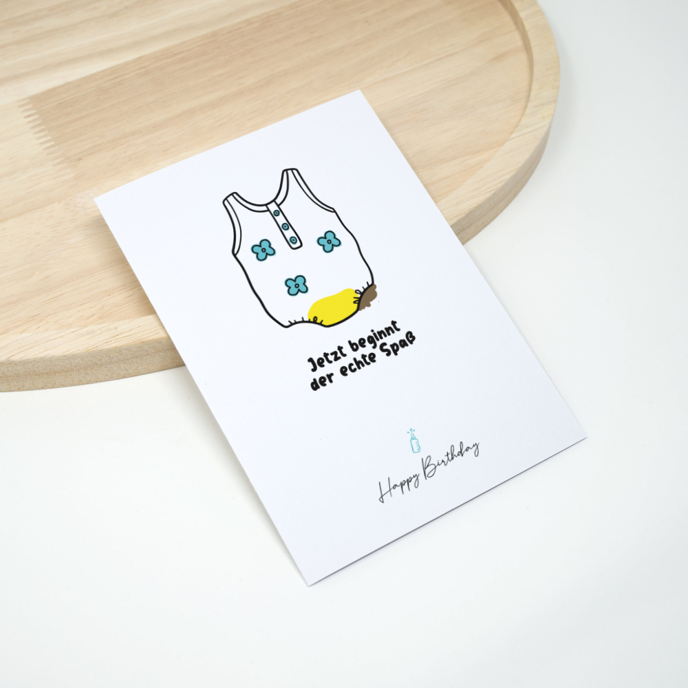 Geburtstagskarte - Echter Spaß ist eine Karte für alle, die zum Geburtstag lieber mit einem trockenen Spruch um die Ecke kommen statt mit Blümchen-Texten. Sie ist als A6 Klappkarte (230 g Papier matt) handgefalzt und lässt sich innen gut beschriften. Dazu bekommst du einen passenden, von uns handgefertigten Briefumschlag – damit du die Karte direkt verschenken kannst.