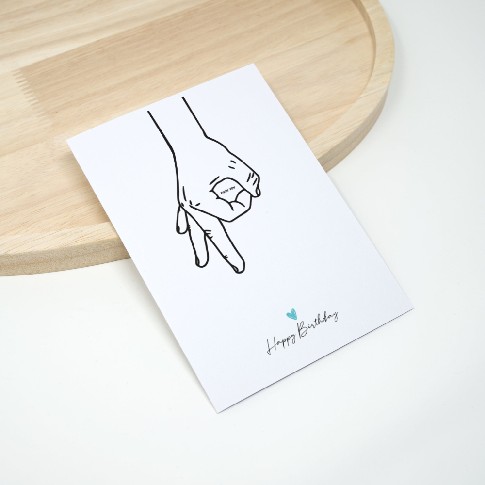 Geburtstagskarte - Fck you ist eine Karte für alle, die zum Geburtstag lieber mit einem trockenen Spruch um die Ecke kommen statt mit Blümchen-Texten. Sie ist als A6 Klappkarte (230 g Papier matt) handgefalzt und lässt sich innen gut beschriften. Dazu bekommst du einen passenden, von uns handgefertigten Briefumschlag – damit du die Karte direkt verschenken kannst.