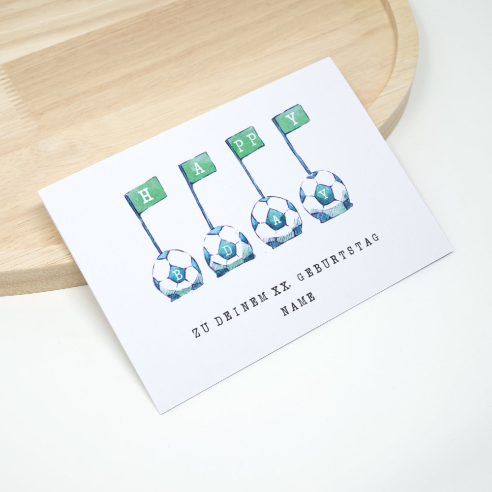 Ideal für jeden Fußball Fan. Du kannst die Fußball Geburtstagskarte mit einen Wunschnamen und einen Wunschalter individualisieren.