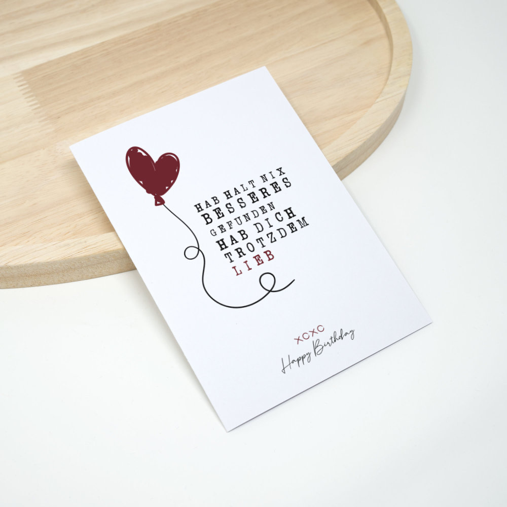 Geburtstagskarte - Hab dich lieb ist eine Karte für alle, die zum Geburtstag lieber mit einem trockenen Spruch um die Ecke kommen statt mit Blümchen-Texten. Sie ist als A6 Klappkarte (230 g Papier matt) handgefalzt und lässt sich innen gut beschriften. Dazu bekommst du einen passenden, von uns handgefertigten Briefumschlag – damit du die Karte direkt verschenken kannst.