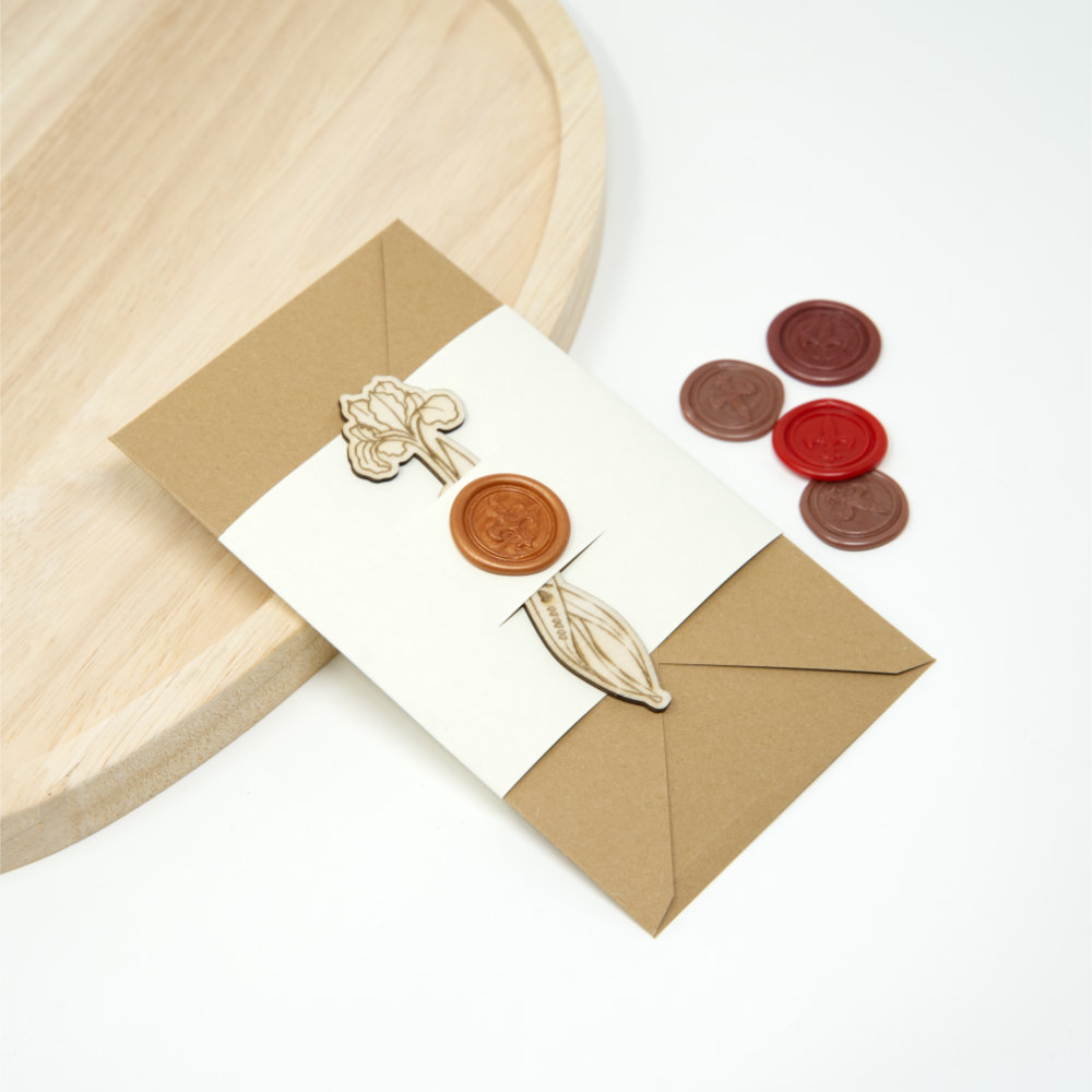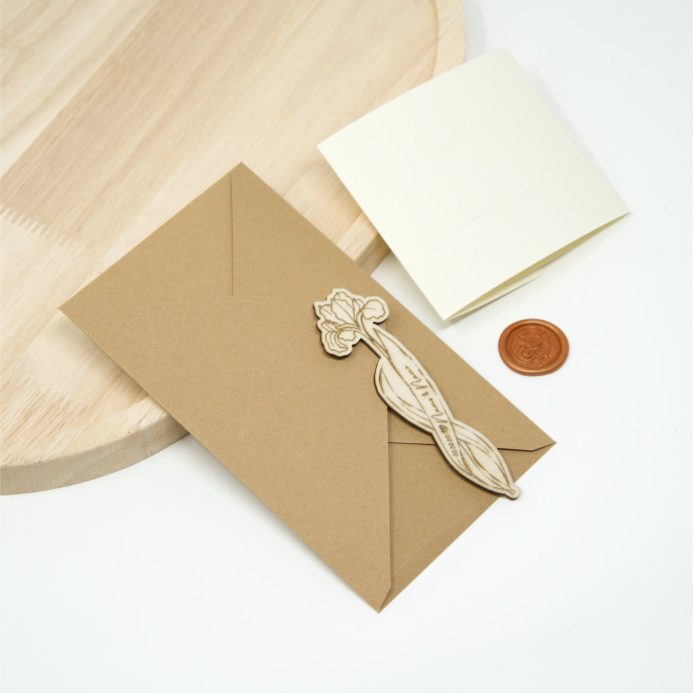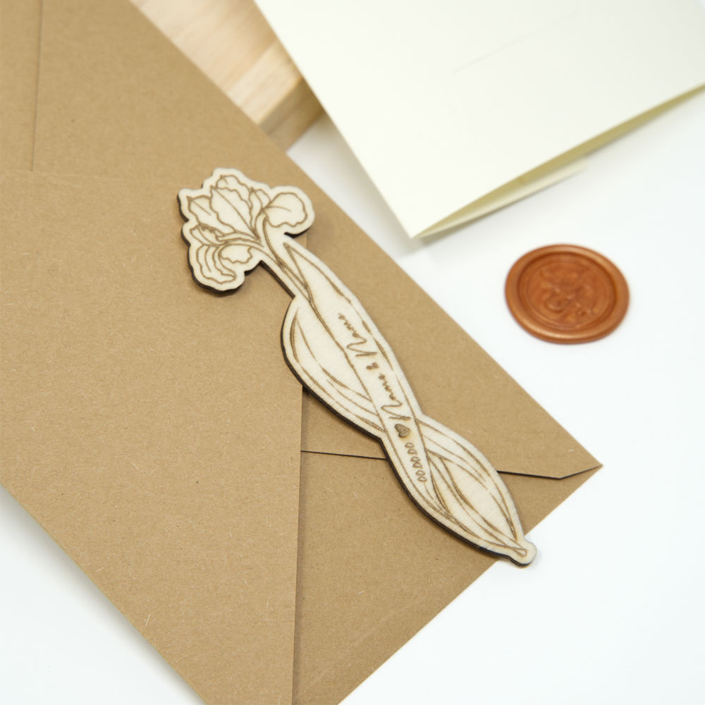 Das Wachssiegel zeigt eine Schwertlilie, seit jeher ein Symbol für Treue, Liebe und Schutz. Dasselbe Motiv trägt auch das Holzlesezeichen, das die Namen des Brautpaares und das Hochzeitsdatum als Lasergravur zeigt. Es ist nicht nur Verpackung, sondern ein bleibendes Erinnerungsstück. Als Holzlesezeichen Gravur Hochzeit findet es auch nach der Feier seinen Platz, auf dem Nachttisch, im Buch oder als Dekoelement.