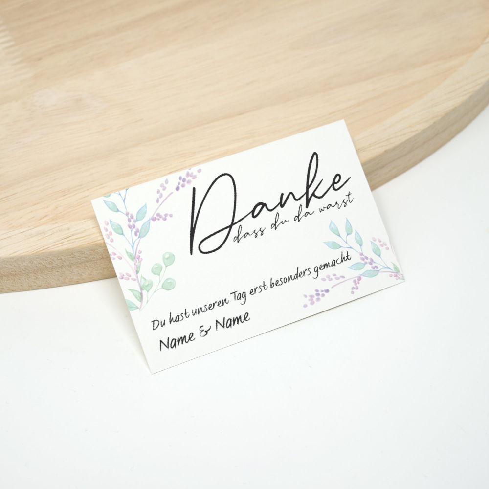 Auf der Rückseite der Dankeskarte bleibt Platz für persönliche Worte. Ob ein kurzer Dank oder ein paar individuelle Zeilen, die Karte bietet Raum für das, was euch wichtig ist. Gerade die handschriftliche Ergänzung verleiht jeder Karte eine besondere Nähe.