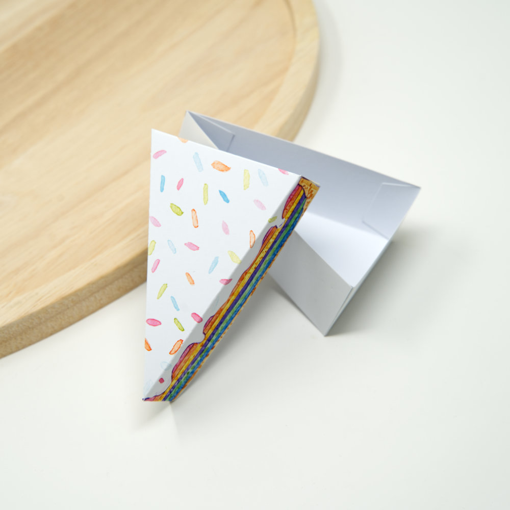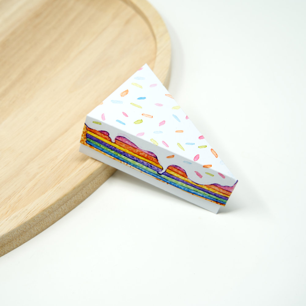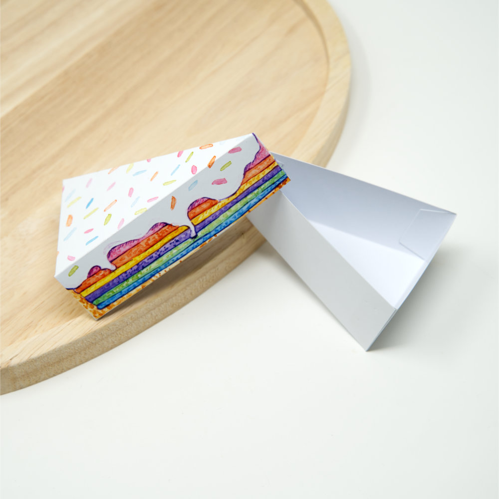 Wer kleine Geschenke überreicht, weiß, dass die Verpackung oft genauso viel erzählt wie der Inhalt. Diese Papier Tortenstück Geschenkbox macht aus einer kleinen Aufmerksamkeit ein richtiges Erlebnis. Die Regenbogentorte mit ihren leuchtenden Schichten, der weißen Glasur und den bunten Streuseln wirkt fröhlich, farbenfroh und einladend. Ein Hingucker, der sofort für gute Stimmung sorgt.