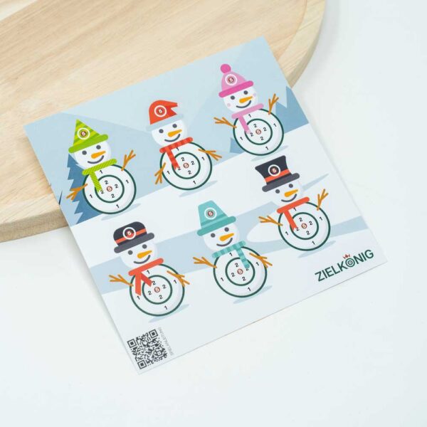 Sechs kleine Schneemänner, klare Trefferzonen und ein Design, das sofort gute Laune macht – unsere Schneemann-Zielscheibe bringt dir winterliches Flair direkt in den Kugelfang. Jede Figur besitzt eine markierte Bauchfläche und eine winzige 5-mm-Challenge-Zone auf dem Hut, ideal für alle, die es gern präzise mögen und ihren Ehrgeiz ein bisschen herausfordern wollen.