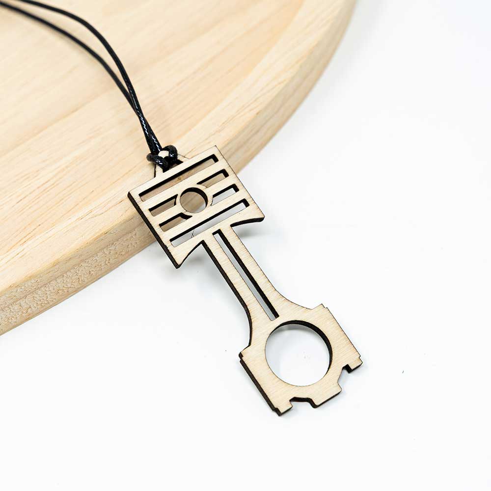 Kolben und Pleuel – für Tuning-Enthusiasten sind das keine abstrakten Begriffe, sondern das Herzstück eines Motors. Dieser Anhänger zeigt beides in einer stilisierten Form aus Holz, eine Seite naturbelassen, die andere von Hand mit schwarzer Acrylfarbe bemalt. Er kommt mit einer schwarzen gewachsten Schnur und lässt sich einfach am Innenspiegel befestigen.