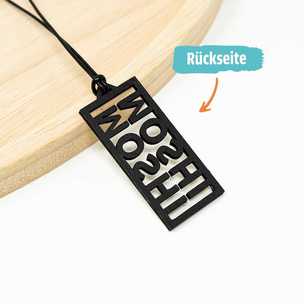 Jeder JDM Spiegelanhänger aus Holz wird bei uns von Hand mit schwarzer Acrylfarbe bemalt. Die naturbelassene Holzseite gibt dem Text Wärme, die schwarz bemalte Rückseite sorgt für den nötigen Kontrast. Kein Stück sieht exakt wie das andere aus, weil die Maserung des Holzes immer ein wenig variiert.