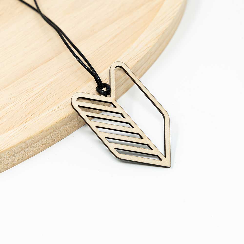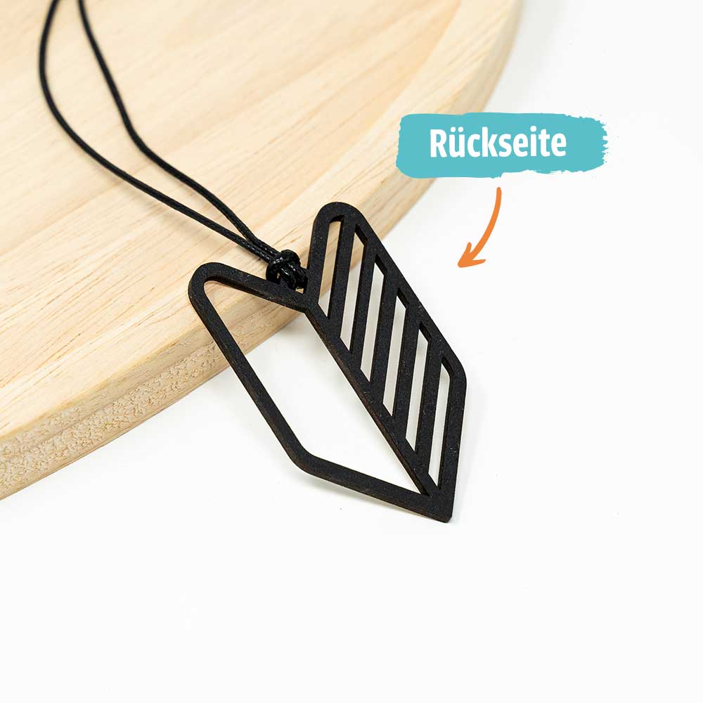 Das Wakaba-Zeichen ist in der Tuning-Szene längst mehr als ein japanisches Verkehrszeichen – es steht für Leidenschaft, Stil und die Liebe zum Auto. Dieser Anhänger zeigt das Symbol in einer stilisierten Form aus Holz, eine Seite naturbelassen, die andere von Hand mit schwarzer Acrylfarbe bemalt. Er kommt mit einer schwarzen gewachsten Schnur und lässt sich einfach am Innenspiegel befestigen.