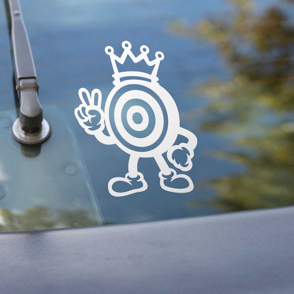 Zieli, die kleine Zielscheibe mit Armen, Beinen und Krone, bringt Humor und Persönlichkeit auf jede Oberfläche. Der wetterfeste, UV-stabile Sticker haftet sicher auf Koffer, Werkzeugbox, Auto oder Laptop und lässt sich bei Bedarf rückstandslos entfernen.