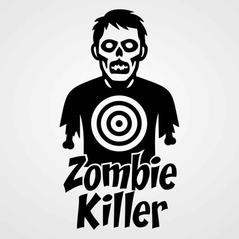Der Zombie mit der Zielscheibe auf der Brust ist so gestaltet, dass der Blick sofort auf den Trefferbereich fällt. Der Schriftzug „Zombie Killer“ ergänzt das Motiv ohne Umwege und macht die Aussage eindeutig. Zusammen wirkt es wie ein augenzwinkerndes Statement, das trotzdem sauber gestaltet bleibt.